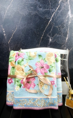 BOLANGDE Набор махровых полотенец для ванной, банное и для лица и рук, 100% хлопок, Япония Пионы 70х140 и 50х90, голубой 2 шт