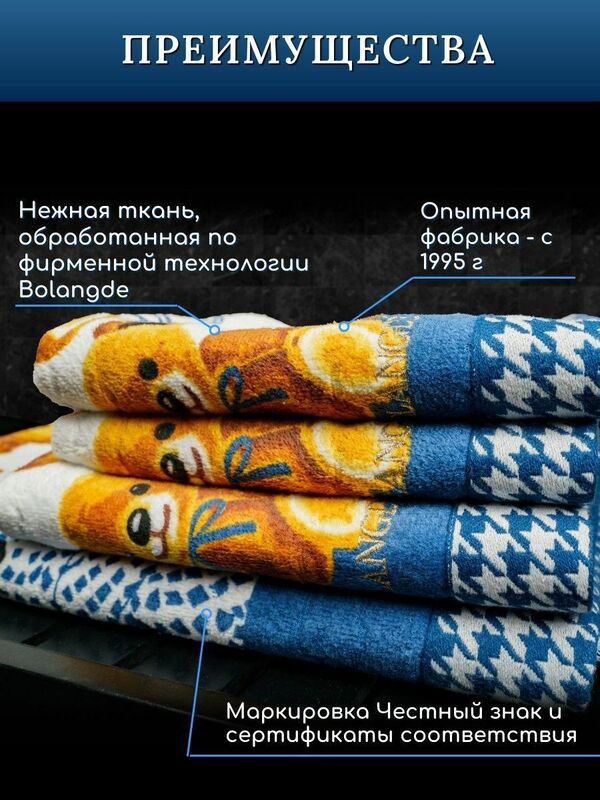 Детские полотенца Bolangde - это нежная забота для ваших малышей. Детские рисунки помогут сделать купание еще более приятным. Уникальные полотенца BOLANGDE от японской фабрики KUSUBASHI с запатентованным дизайном. Это значит, что такой рисунок не могут использовать другие бренды, а вы покупаете неповторимую оригинальную вещь. Коллекция махрово-велюровых полотенец ЯПОНИЯ торговой марки Bolangde (Боландже) произведена на японском оборудовании из 100% высококачественного хлопка с применением особо стойких японских красителей и закрепителей цвета, что позволяет использовать в одном изделии множество ярких цветов. Произведено на японском оборудовании. Внутренняя сторона - махра. Внешняя сторона - стриженная махра. В коллекции с цветами принтованная только внешняя сторона, внутренняя - гладкий белый хлопок. При производстве используются все последние Японские технологии, только натуральный хлопок и безвредные красители 4го уровня безопасности. Материал полотенец произведен из высококачественного хлопка, который проходит несколько стадий обработки по удалению мелких волокон, что позволяет получить мягкий и нежный ворс. Японские технологии дали возможность совместить пестротканое плетение, велюр, усиленную обшивку (оверлок), что позволяет им не расползаться и сохранить прекрасный внешний вид.. Подобная технология производстсва позволяет получить: - мягкие и комфортные к телу полотенца, - прочную ткань, которая выдерживает многочисленные стирки - стойкий цвет. - полотенца хорошо впитывают воду и при этом быстро сохнут. Каждая модель есть в четырех размерах, чтобы каждый мог выбрать полотенца согласно своим привычкам. Уже более ста лет, фабрика KUSUBASHI обеспечивает потребности трех поколений императорского двора Японии. Это существенный повод доверять качеству данной фабрики.