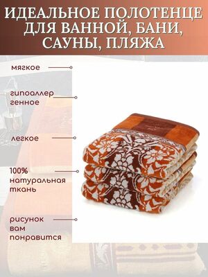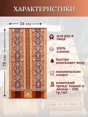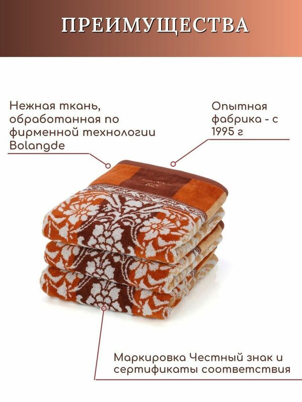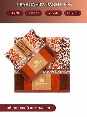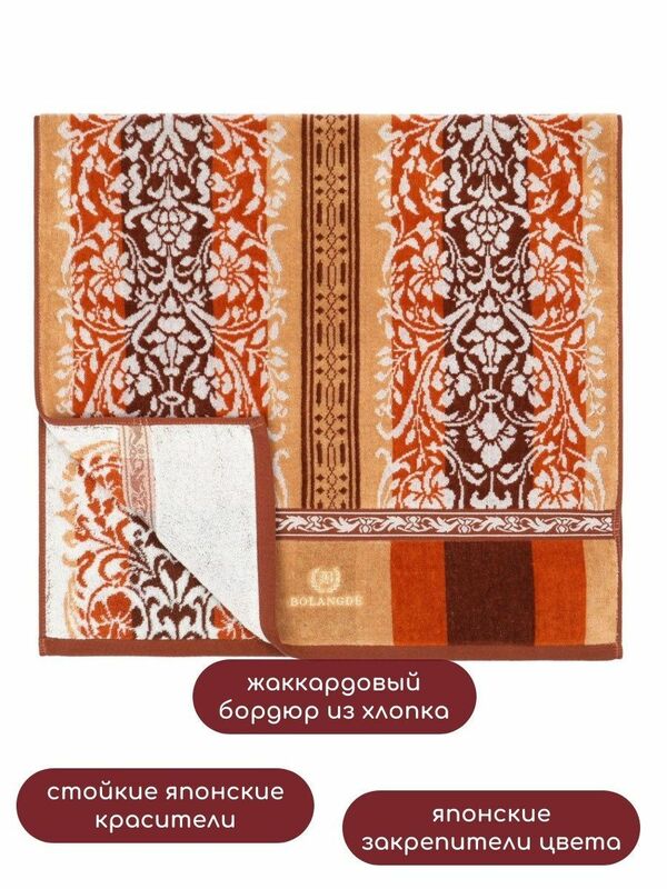 "Полотенца для ванной BOLANGDE Япония Арабеска 3025 - роскошная расцветка, которая подойдет как для классического интерьера, так и для современного. Уникальные полотенца BOLANGDE от японской фабрики KUSUBASHI Mon-OriCo с запатентованным дизайном - с одной стороны махровые и велюровые с другой. Полотенца выпускались и выпускаются на производственных мощностях KUSUBASHI Mon-OriCo под полным контролем и японского менеджмента, территориально завод размещен на территории КНР. Технология производства таких полотенец подразумевает со стороны рисунка поверхностный обжиг огнем верхней кромки волокон для равномерной длины ворса и мягкости кончиков. И чтобы рисунок лучше ложился и держался на протяжении всего времени использования, плотность полотенца должна быть 300 гр/м2. Они не относятся к разряду ""мохнатых"" махровых полотенец. Bolangde - особый продукт. Японские технологии позволили сделать полотенце тонким, крависым и долговечным, а отборный хлопок приятным и нежным. Все дизайны и технологии запатентованы фабрикой. Это значит, что такой рисунок не могут использовать другие бренды, а вы покупаете неповторимую оригинальную вещь. Коллекция махрово-велюровых полотенец ЯПОНИЯ торговой марки Bolangde (Боландже) произведена на японском оборудовании из 100% высококачественного хлопка с применением особо стойких японских красителей и закрепителей цвета, что позволяет использовать в одном изделии множество ярких цветов. Внутренняя сторона - махровая. Внешняя сторона - стриженная махра. В коллекции с цветами принтованная только внешняя сторона, внутренняя - гладкий белый хлопок. В геометричных рисунках и модели Арабеска обе стороны с рисунком, т.к. производятся путем жаккардового плетения уже готовых прокрашенных нитей. При производстве используются все последние Японские технологии, только натуральный хлопок и безвредные красители 4го уровня безопасности. Материал полотенец произведен из высококачественного хлопка, который проходит несколько стадий обработки по удалению мелких волокон, что позволяет получить мягкий и нежный ворс. Японские технологии дали возможность совместить пестротканое плетение, велюр, усиленную обшивку (оверлок), что позволяет им не расползаться и сохранить прекрасный внешний вид. Подобная технология производства позволяет получить: - мягкие и комфортные к телу полотенца; - прочную ткань, которая выдерживает многочисленные стирки; - стойкий цвет; - полотенца хорошо впитывают воду и при этом быстро сохнут. Каждая модель есть в четырех размерах, чтобы каждый мог выбрать полотенца согласно своим привычкам: · полотенца большие банные есть в двух размерах 70х140 и 100х150, чем может похвастаться не каждый бренд. Удобно использовать для ванной, для сауны и бани, а также как пляжное. · полотенце для лица махровое 50х90 · полотенце для рук, для ног 34х78 в наборе 2 шт. · идеально выглядит набор полотенец. Обычно покупают одно из банных и лицевое, или банное и для рук. Уже более ста лет, фабрика KUSUBASHI обеспечивает потребности трех поколений императорского двора Японии. Это существенный повод доверять качеству данной фабрики. Полотенца Bolangde с цветочным рисунком - прекрасные подарки женщинам: бабушке, девушке, подарок маме, учителю, воспитателю."