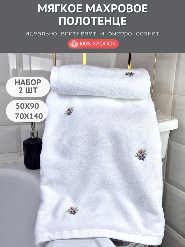 Набор банных полотенец - махровое большое с петелькой с мелким цветочком 70х140 и для лица 50х90 являются новой моделью натуральных хлопковых изделий бренда 7Я Атмосфера благополучия. 7-я текстиль банное в цветок белое полотенце для тела с пышным ворсом быстро впитывает воду. Полотенца с петелькой однотонные ванные с небольшими вышитыми цветками 7Я текстиль произведены из 100% хлопка. Нитка прошла специальную обработку для смягчения, поэтому изделие очень мягкое, пушистое и приятное наощупь. В коллекции 7 текстиль - 70 140 и 50 90 самый часто используемый набор полотенец для ванны. Полотенце махровое китайское быстро впитывает воду и также быстро высыхает. Большой размер 70*140 удобно использовать как после душа, так и взять с собой в бассейн или в сауну, быстросохнущее, удобно завернуться целиком. Размер 50*90 идеально подходит для того, чтобы обернуть волосы или для лица.
