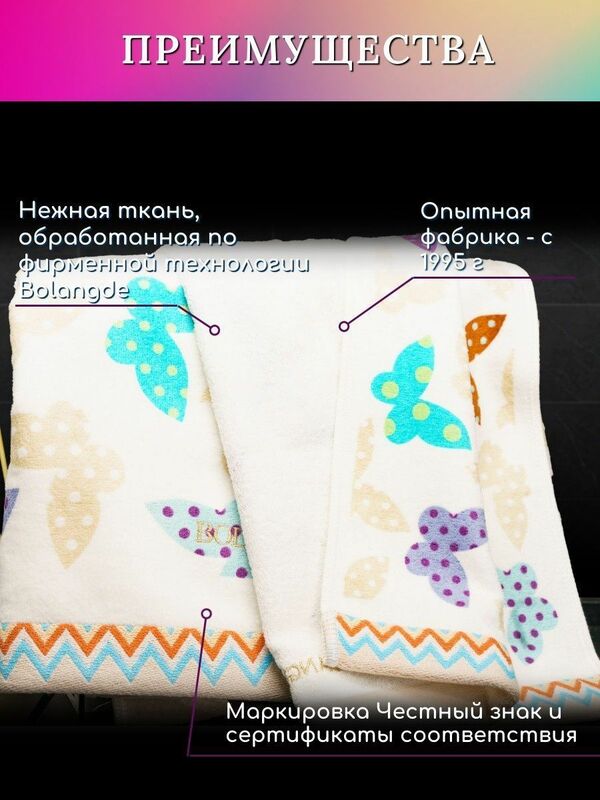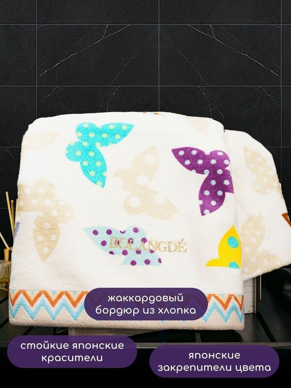 "Полотенце банное махровое BOLANGDE Бабочки 2038 - милейшая модель коллекции. Идеально использовать как детское полотенце, так и для взрослых. Уникальные махровые полотенца BOLANGDE от японской фабрики KUSUBASHI Mon-OriCo с запатентованным дизайном - с одной стороны и велюровые с другой. Технология производства такого полотенца подразумевает со стороны рисунка поверхностный обжиг огнем верхней кромки волокон для равномерной длины ворса и мягкости кончиков. Все дизайны и технологии запатентованы фабрикой. Это значит, что такой рисунок не могут использовать другие бренды, а вы покупаете неповторимую оригинальную вещь. Коллекция махрово-велюровых полотенец ЯПОНИЯ торговой марки Bolangde (Боландже) произведена на японском оборудовании из 100% высококачественного хлопка с применением особо стойких японских красителей и закрепителей цвета, что позволяет использовать в одном изделии множество ярких цветов. Внутренняя сторона - махровая. Внешняя сторона - стриженная махра. В коллекции с цветами принтованная только внешняя сторона, внутренняя - гладкий белый хлопок. При производстве используются все последние Японские технологии, только натуральный хлопок и безвредные красители 4го уровня безопасности. Материал полотенец произведен из высококачественного хлопка, который проходит несколько стадий обработки по удалению мелких волокон, что позволяет получить мягкий и нежный ворс. Японские технологии дали возможность совместить пестротканое плетение, велюр, усиленную обшивку (оверлок), что позволяет им не расползаться и сохранить прекрасный внешний вид. Подобная технология производства позволяет получить: - мягкие и комфортные к телу полотенца; - прочную ткань, которая выдерживает многочисленные стирки; - стойкий цвет; - полотенца хорошо впитывают воду и при этом быстро сохнут. Каждая модель есть в четырех размерах, чтобы каждый мог выбрать полотенца согласно своим привычкам: · полотенца большие банные есть в двух размерах 70х140 и 100х150, чем может похвастаться не каждый бренд. Удобно использовать для ванной, для сауны и бани, а также как пляжное. · полотенце для лица махровое 50х90 · полотенце для рук, для ног 34х78 в наборе 2 шт. · идеально выглядит набор полотенец. Обычно покупают одно из банных и лицевое, или банное и для рук. Уже более ста лет, фабрика KUSUBASHI обеспечивает потребности трех поколений императорского двора Японии. Это существенный повод доверять качеству данной фабрики. Полотенца Bolangde с цветочным рисунком - прекрасные подарки женщинам: бабушке, девушке, подарок маме, учителю, воспитателю."