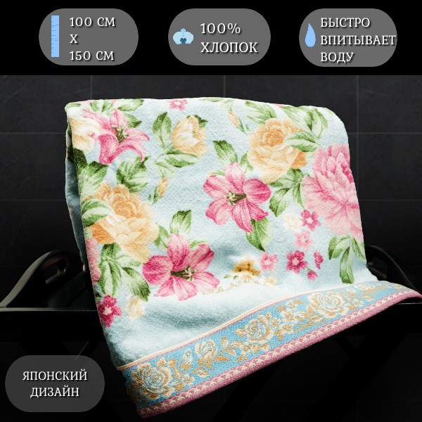 Отзывы - BOLANGDE Полотенце для ванной и сауны махровое банное большое, велюровое, 100% хлопок, рисунок цветы, Япония Пионы100х150, голубой 1 штОставить отзыв