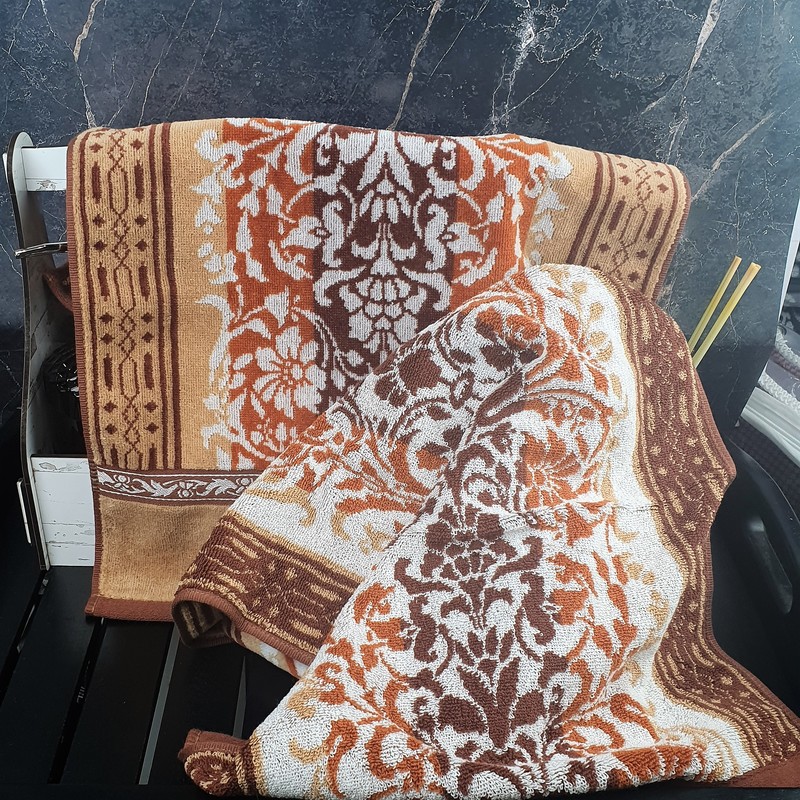 "Полотенца для ванной BOLANGDE Япония Арабеска 3025 - роскошная расцветка, которая подойдет как для классического интерьера, так и для современного. Уникальные полотенца BOLANGDE от японской фабрики KUSUBASHI Mon-OriCo с запатентованным дизайном - с одной стороны махровые и велюровые с другой. Полотенца выпускались и выпускаются на производственных мощностях KUSUBASHI Mon-OriCo под полным контролем и японского менеджмента, территориально завод размещен на территории КНР. Технология производства таких полотенец подразумевает со стороны рисунка поверхностный обжиг огнем верхней кромки волокон для равномерной длины ворса и мягкости кончиков. И чтобы рисунок лучше ложился и держался на протяжении всего времени использования, плотность полотенца должна быть 300 гр/м2. Они не относятся к разряду ""мохнатых"" махровых полотенец. Bolangde - особый продукт. Японские технологии позволили сделать полотенце тонким, крависым и долговечным, а отборный хлопок приятным и нежным. Все дизайны и технологии запатентованы фабрикой. Это значит, что такой рисунок не могут использовать другие бренды, а вы покупаете неповторимую оригинальную вещь. Коллекция махрово-велюровых полотенец ЯПОНИЯ торговой марки Bolangde (Боландже) произведена на японском оборудовании из 100% высококачественного хлопка с применением особо стойких японских красителей и закрепителей цвета, что позволяет использовать в одном изделии множество ярких цветов. Внутренняя сторона - махровая. Внешняя сторона - стриженная махра. В коллекции с цветами принтованная только внешняя сторона, внутренняя - гладкий белый хлопок. В геометричных рисунках и модели Арабеска обе стороны с рисунком, т.к. производятся путем жаккардового плетения уже готовых прокрашенных нитей. При производстве используются все последние Японские технологии, только натуральный хлопок и безвредные красители 4го уровня безопасности. Материал полотенец произведен из высококачественного хлопка, который проходит несколько стадий обработки по удалению мелких волокон, что позволяет получить мягкий и нежный ворс. Японские технологии дали возможность совместить пестротканое плетение, велюр, усиленную обшивку (оверлок), что позволяет им не расползаться и сохранить прекрасный внешний вид. Подобная технология производства позволяет получить: - мягкие и комфортные к телу полотенца; - прочную ткань, которая выдерживает многочисленные стирки; - стойкий цвет; - полотенца хорошо впитывают воду и при этом быстро сохнут. Каждая модель есть в четырех размерах, чтобы каждый мог выбрать полотенца согласно своим привычкам: · полотенца большие банные есть в двух размерах 70х140 и 100х150, чем может похвастаться не каждый бренд. Удобно использовать для ванной, для сауны и бани, а также как пляжное. · полотенце для лица махровое 50х90 · полотенце для рук, для ног 34х78 в наборе 2 шт. · идеально выглядит набор полотенец. Обычно покупают одно из банных и лицевое, или банное и для рук. Уже более ста лет, фабрика KUSUBASHI обеспечивает потребности трех поколений императорского двора Японии. Это существенный повод доверять качеству данной фабрики. Полотенца Bolangde с цветочным рисунком - прекрасные подарки женщинам: бабушке, девушке, подарок маме, учителю, воспитателю."
