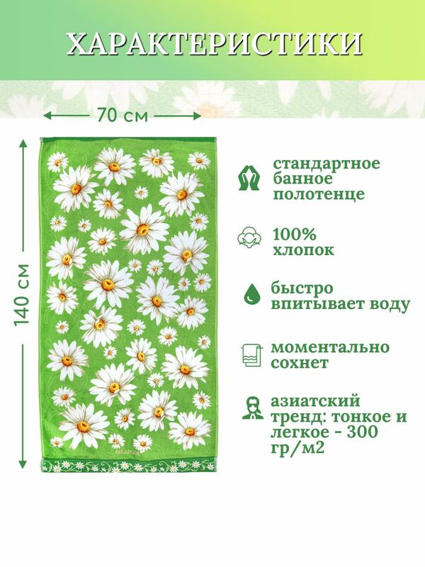 BOLANGDE Полотенце Япония баня РОМАШКИ ЗЕЛЕНЫЕ 70х140