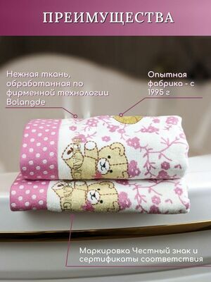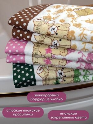 Детские полотенца Bolangde - это нежная забота для ваших малышей. Детские рисунки помогут сделать купание еще более приятным. Уникальные полотенца BOLANGDE от японской фабрики KUSUBASHI с запатентованным дизайном. Это значит, что такой рисунок не могут использовать другие бренды, а вы покупаете неповторимую оригинальную вещь. Коллекция махрово-велюровых полотенец ЯПОНИЯ торговой марки Bolangde (Боландже) произведена на японском оборудовании из 100% высококачественного хлопка с применением особо стойких японских красителей и закрепителей цвета, что позволяет использовать в одном изделии множество ярких цветов. Произведено на японском оборудовании. Внутренняя сторона - махра. Внешняя сторона - стриженная махра. В коллекции с цветами принтованная только внешняя сторона, внутренняя - гладкий белый хлопок. При производстве используются все последние Японские технологии, только натуральный хлопок и безвредные красители 4го уровня безопасности. Материал полотенец произведен из высококачественного хлопка, который проходит несколько стадий обработки по удалению мелких волокон, что позволяет получить мягкий и нежный ворс. Японские технологии дали возможность совместить пестротканое плетение, велюр, усиленную обшивку (оверлок), что позволяет им не расползаться и сохранить прекрасный внешний вид.. Подобная технология производстсва позволяет получить: - мягкие и комфортные к телу полотенца, - прочную ткань, которая выдерживает многочисленные стирки - стойкий цвет. - полотенца хорошо впитывают воду и при этом быстро сохнут. Каждая модель есть в четырех размерах, чтобы каждый мог выбрать полотенца согласно своим привычкам. Уже более ста лет, фабрика KUSUBASHI обеспечивает потребности трех поколений императорского двора Японии. Это существенный повод доверять качеству данной фабрики.