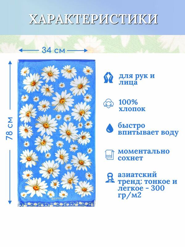 Полотенце BOLANGDE Япония 2026 РОМАШКИ - веселый цветочный принт для любителей замечательного летнего цветка - ромашка. Уникальные полотенца BOLANGDE от японской фабрики KUSUBASHI с запатентованным дизайном. Это значит, что такой рисунок не могут использовать другие бренды, а вы покупаете неповторимую оригинальную вещь. Коллекция махрово-велюровых полотенец ЯПОНИЯ торговой марки Bolangde (Боландже) произведена на японском оборудовании из 100% высококачественного хлопка с применением особо стойких японских красителей и закрепителей цвета, что позволяет использовать в одном изделии множество ярких цветов. Произведено на японском оборудовании. Внутренняя сторона - махра. Внешняя сторона - стриженная махра. В коллекции с цветами принтованная только внешняя сторона, внутренняя - гладкий белый хлопок. При производстве используются все последние Японские технологии, только натуральный хлопок и безвредные красители 4го уровня безопасности. Материал полотенец произведен из высококачественного хлопка, который проходит несколько стадий обработки по удалению мелких волокон, что позволяет получить мягкий и нежный ворс. Японские технологии дали возможность совместить пестротканое плетение, велюр, усиленную обшивку (оверлок), что позволяет им не расползаться и сохранить прекрасный внешний вид.. Подобная технология производстсва позволяет получить: - мягкие и комфортные к телу полотенца, - прочную ткань, которая выдерживает многочисленные стирки - стойкий цвет. - полотенца хорошо впитывают воду и при этом быстро сохнут. Каждая модель есть в четырех размерах, чтобы каждый мог выбрать полотенца согласно своим привычкам. Уже более ста лет, фабрика KUSUBASHI обеспечивает потребности трех поколений императорского двора Японии. Это существенный повод доверять качеству данной фабрики.