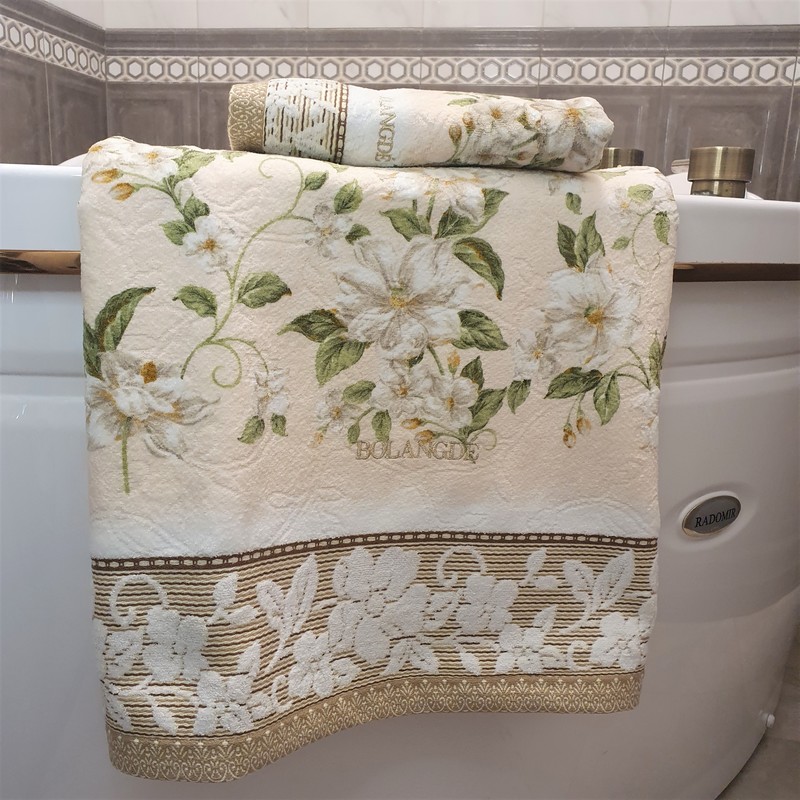 Полотенце BOLANGDE Япония ЖАСМИН 2015 - классическое нежное сочетание цветом в пастельных тонах. Уникальные полотенца BOLANGDE от японской фабрики KUSUBASHI с запатентованным дизайном. Это значит, что такой рисунок не могут использовать другие бренды, а вы покупаете неповторимую оригинальную вещь. Коллекция махрово-велюровых полотенец ЯПОНИЯ торговой марки Bolangde (Боландже) произведена на японском оборудовании из 100% высококачественного хлопка с применением особо стойких японских красителей и закрепителей цвета, что позволяет использовать в одном изделии множество ярких цветов. Произведено на японском оборудовании. Внутренняя сторона - махра. Внешняя сторона - стриженная махра. В коллекции с цветами принтованная только внешняя сторона, внутренняя - гладкий белый хлопок. При производстве используются все последние Японские технологии, только натуральный хлопок и безвредные красители 4го уровня безопасности. Материал полотенец произведен из высококачественного хлопка, который проходит несколько стадий обработки по удалению мелких волокон, что позволяет получить мягкий и нежный ворс. Японские технологии дали возможность совместить пестротканое плетение, велюр, усиленную обшивку (оверлок), что позволяет им не расползаться и сохранить прекрасный внешний вид.. Подобная технология производстсва позволяет получить: - мягкие и комфортные к телу полотенца, - прочную ткань, которая выдерживает многочисленные стирки - стойкий цвет. - полотенца хорошо впитывают воду и при этом быстро сохнут. Каждая модель есть в четырех размерах, чтобы каждый мог выбрать полотенца согласно своим привычкам. Уже более ста лет, фабрика KUSUBASHI обеспечивает потребности трех поколений императорского двора Японии. Это существенный повод доверять качеству данной фабрики.