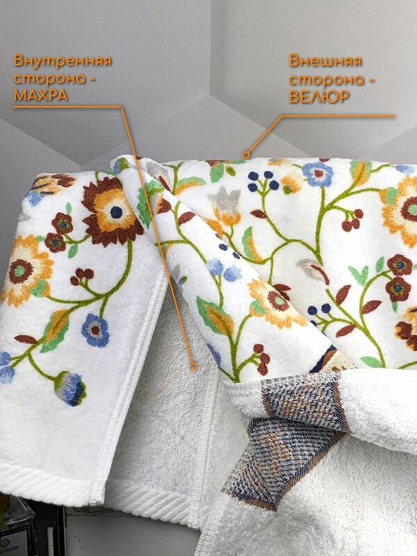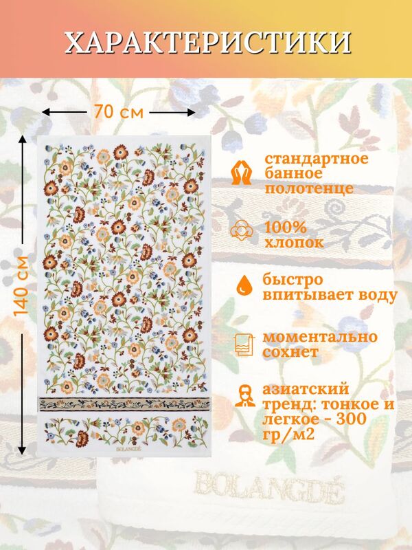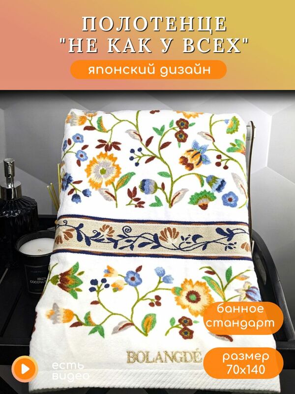 Полотенце BOLANGDE Япония Васильки 2021 - яркие полевые цветы в нежном японском исполнении. Уникальные полотенца BOLANGDE от японской фабрики KUSUBASHI с запатентованным дизайном. Это значит, что такой рисунок не могут использовать другие бренды, а вы покупаете неповторимую оригинальную вещь. Коллекция махрово-велюровых полотенец ЯПОНИЯ торговой марки Bolangde (Боландже) произведена на японском оборудовании из 100% высококачественного хлопка с применением особо стойких японских красителей и закрепителей цвета, что позволяет использовать в одном изделии множество ярких цветов. Произведено на японском оборудовании. Внутренняя сторона - махра. Внешняя сторона - стриженная махра. В коллекции с цветами принтованная только внешняя сторона, внутренняя - гладкий белый хлопок. При производстве используются все последние Японские технологии, только натуральный хлопок и безвредные красители 4го уровня безопасности. Материал полотенец произведен из высококачественного хлопка, который проходит несколько стадий обработки по удалению мелких волокон, что позволяет получить мягкий и нежный ворс. Японские технологии дали возможность совместить пестротканое плетение, велюр, усиленную обшивку (оверлок), что позволяет им не расползаться и сохранить прекрасный внешний вид.. Подобная технология производстсва позволяет получить: - мягкие и комфортные к телу полотенца, - прочную ткань, которая выдерживает многочисленные стирки - стойкий цвет. - полотенца хорошо впитывают воду и при этом быстро сохнут. Каждая модель есть в четырех размерах, чтобы каждый мог выбрать полотенца согласно своим привычкам. Уже более ста лет, фабрика KUSUBASHI обеспечивает потребности трех поколений императорского двора Японии. Это существенный повод доверять качеству данной фабрики.